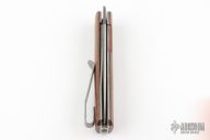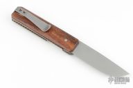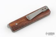This Miscreant by Brad Zinker features a stonewashed blade with notched thumbrest and front flipper. The handle has wood scales, satin titanium liners with laser engraved interirors, titanium tip up clip. Rides on bearings, nice detent, lockup and blade seating. Comes with a zippered case. New from maker.