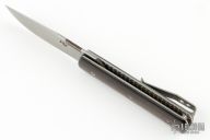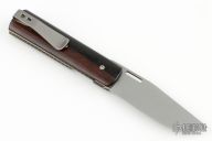 This Linerlock flipper from Brad Zinker features a stonewash finished blade with checkered thumbrest and flipper. The handle has cocobolo wood scales, titanium liners with laser engraved interiors, stonewashed titanium tip up clip. Nice detent, lockup and blade seating, rides on bearings. Includes a padded zippered case. New from maker.