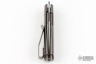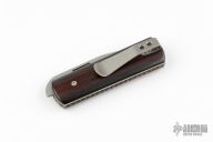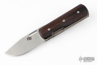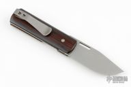 This Linerlock front flipper from Brad Zinker features a stonewash finished blade with checkered thumbrest and flipper. The handle has cocobolo wood scales, titanium liners with laser engraved interiors, stonewashed titanium tip up clip. Nice detent, lockup and blade seating, rides on bearings. Includes a padded zippered case. New from maker.