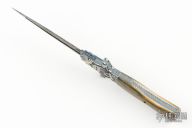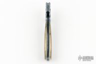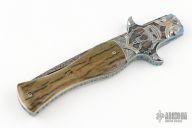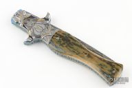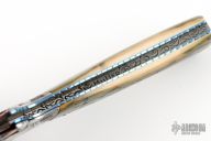 This knife by Jody Muller features a Mosaic Damascus blade with false top edge and fullers. The handle has engraved stainless steel bolsters with copper and gold inlays, mammoth ivory scales, anodized and fileworked titanium liners, and a gold inlaid stainless steel backspacer. Nice detent, lockup and blade seating. Excellent condition. Engraving done by Jody Muller.