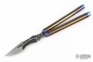 This balisong by David Ceroni features a two-tone hand rub satin finished blade with carbon fiber inlays in the blade. The handles are integral anodized titanium carbon fiber inlays. Includes a padded zippered case. Excellent condition.