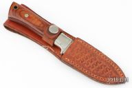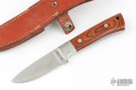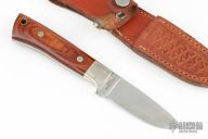 This knife by M Star was made by Hattori Ichiro, it features a satin finished blade with .144" blade stock and 1.025" blade depth, full tang construction. The handle has nickel silver bolsters, laminated wood scales. Comes with a hand tooled brown leather sheath. Has a couple light scratches, otherwise excellent condition.