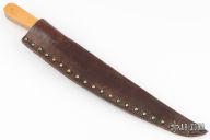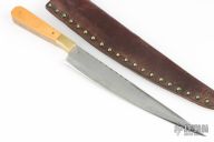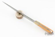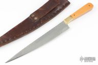 This knife by John Teague features a satin finished blade with a fileworked spine, .187" blade stock and 1.259" blade depth, full tang construction. The handle has brass bolsters, yellow paper micarta scales with brass pins. Comes with a brown leather sheath with brass studs. Has some light scratches and patina, otherwise good condition.