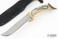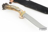 This knife by Ted Miller features a mirror polished blade with .118" blade stock and 1.227" blade depth, hidden tang construction. The handle has a brass guard and a carved crown stag grip with turquoise and mother of pearl inlaid into the handle. "TM 1304" is etched onto the ricasso. Comes with a black leather sheath. Has a few light scratches, otherwise excellent condition.