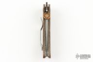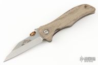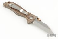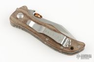 This Mini Seax by Emerson Knives features a stonewash wharncliffe blade with copper compass thumbdisc, notched thumbrest and wave feature. The handle has brown micarta scales, titanium liners, black tip up stainless steel clip. Excellent condition. Comes with original box and papers and original thumbdisc. #0280