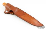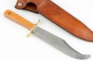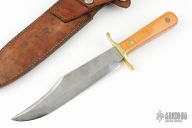 This bowie by J.H.L. (please let us know if you know who this is) features a satin finished blade with nearly sharpened top edge, .175" blade stock and 1.505" blade depth, full tang construction. The handle has a brass guard and yellow paper micarta scales. Comes with a brown leather sheath. Has some scratches and oxidation, otherwise good condition.