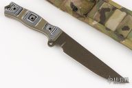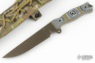 This Nano Urgent Fury by Busse features a bronze coated blade, .184" blade stock and 1.389" blade depth, full tang construction. The handle has black/grey/green G-10 scales, extended tang with lanyard hole. Comes with a nylon sheath. Excellent condition.
