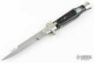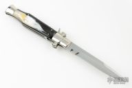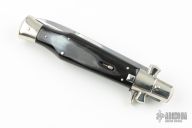 AGA Campolin 11" Blackwidow with Brazil Horn! This Campolin made automatic knife has solid nickel silver bolsters with maltese cross in the hilt. To close this one you use the lock back release at rear of the handle. This makes for very tight and stable construction and it's a bit more robust because of that. Has a mirror polished blade with false top edge. The nickel silver liners and a stainless steel backspacer. Includes a black leather sheath.  Excellent Condition.