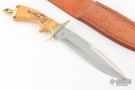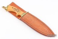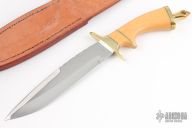 This knife by WL Underwood features a mirror polished blade with sharpened top edge and fileworked spine, .176" blade stock and 1.449" blade depth, hidden tang construction. The handle has a brass double guard and butt, yellow paper micarta grip with black/brass spacers. Comes with a hand tooled brown leather sheath. #1453 on the blade. Has some light scratches, otherwise excellent condition.