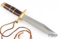 This knife by John Nelson Cooper features a satin finished blade with a nearly sharpened top edge and sawteeth, .173" blade stock and 1.616" blade depth, hidden tang construction. The handle has a brass guard and butt, brown canvas micarta grip with brass spacers. Has some scratches and pitting, otherwise good condition. Comes with a zippered case.