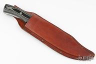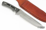 This knife (please let us know if you know who this maker is) features a satin finished blade with false top edge and notched thumbrest, .287" blade stock and 1.786" blade depth, full tang construction with black/white linen micarta scales. Comes with a brown leather sheath. Has a few light scratches, otherwise excellent condition.