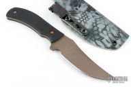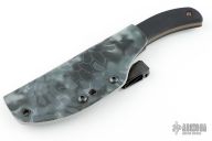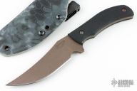 This Nighthawk by Jason Stout features a tumbled blade with .167" blade stock and 1.338" blade depth, full tang construction. The handle has black textured G10 scales with flamed hardware. Comes with a kydex sheath with ulti-clip and COA. Has a couple light scuffs, otherwise excellent condition.