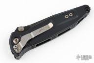 This Signature Series Socom Elite manual linerlock folder by Microtech Knives has a black DLC blade with notched thumbrest and dual thumbstuds. Has a black aluminum handle with carbon fiber inlays, tip down blasted stainless steel clip. Serial number 687 and dated 08/2020. Comes with original box and papers. The inlays are aftermarket.  Has some scratches otherwise the knife is in excellent condition.