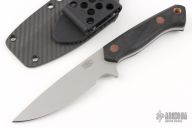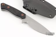 This Skinner by Jason Stout features a stonewashed chisel ground blade with false top edge, .166" blade stock and 1.084" blade depth, full tang construction. The handle has green canvas micarta scales with natural canvas micarta pins. Comes with a kydex sheath with belt clip. Has a couple light scuffs, excellent condition otherwise.