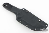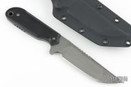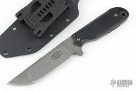 This Fixed bade by Jason Stout features a stonewashed compound grind tanto blade with false top edge, fuller, .199" blade stock and 1.215" blade depth, full tang construction. The handle has black G10 scales with lanyard hole in pommel. Comes with a kydex sheath with belt clip. Has a couple light scuffs, excellent condition otherwise.