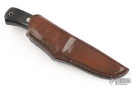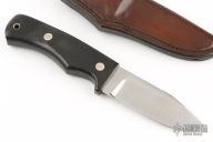 This fixed blade by Jason Stout features a satin finished clip point blade with notched thumb rest, 0.171" blade stock and 1.129" blade depth, hidden tang construction. The handle is micarta with Loveless bolts with lanyard hole at the pommel. Comes with leather belt sheath. Has some light scuffs and some patina. Excellent condition otherwise. Circa 2003.