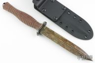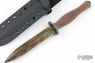 This FS Dagger by Les George and Allen Elishewitz features a double edged blade with fullers, .175" blade stock and .995" blade depth, hidden tang construction. The handle has an anodized titanium guard, micarta grip and titanium butt with lanyard hole. Comes with Kydex sheath with nylon belt loop. Excellent Condition.