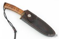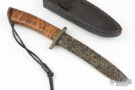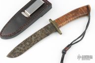 This Fixed Blade by Ray Laconico has a force patina finished blade with hidden tang construction, .217" blade stock, 1.161" depth. The handle has a brass guard and a curly maple grip with brass pin and lanyard hole. Comes with a black leather sheath with belt clip. Excellent condition. Comes with a note from the maker dated 7/6/05.