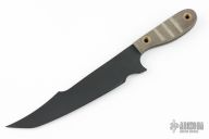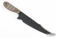 This fixed blade by Jeremy Horton features a black powdercoat chisel ground blade with swedge, .192" blade stock and 1.338" blade depth, full tang construction. The handle has fluted brown micarta scales with flanged brass tube pins. Excellent condition.