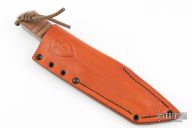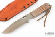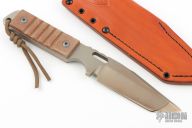 This fixed blade by Jeremy Horton features a bronze chisel ground blade with swedge, .253" blade stock and 1.217" blade depth, full tang construction. The handle has fluted brown micarta scales with lanyard hole in pommel. Comes with York leather sheath. Excellent condition.