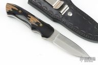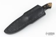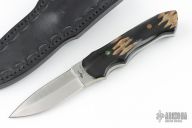 This New York Dagger by Corey Lueneburg is a mixture between a Loveless style New York Special and a Big Bear. It features a satin finished double edged blade, .218" blade stock and 1.024" blade depth, full tang construction. The handle has dyed and jigged buffalo horn scales and brass pins. Comes with a hand tooled black leather sheath. Has a couple light scratches, otherwise excellent condition.