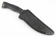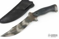 This fighter by Robert Hankins features a tiger stripe finished clip point blade with sharpened top edge, .253" blade stock and 1.705" blade depth, full tang construction with black G-10 scales. Comes with a hand tooled black leather sheath. Has some scratches, has been sharpened, otherwise excellent condition.
