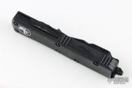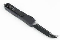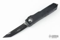 This UTX-85 by Microtech features a black tanto blade with fullers. The handle has a black aluminum frame with black hardware and tip down clip. S/N 12803 dated 04/2018. Has some minor wear on the clip edges and thumbslide, otherwise good condition.