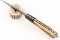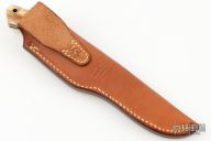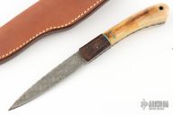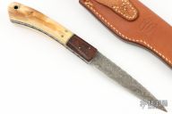 This fixed blade from Colin Cox features a Raindrop Damascus Drop point blade, with .163" blade stock and .720" blade depth, full tang construction. File worked blade spine, and tang. The handle has ironwood bolsters, and pinned fossil mammoth scales. Includes brown leather sheath with belt loop. Has some scuffs, none of the lines in the handle material feel like cracks. Comes with certificate and letter from the maker. Has some patina and some rust at the tip, great condition otherwise.