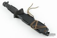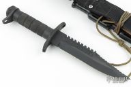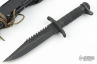 This Buckmaster 184 from Buck Knives has a black blade with a sharpened and serrated top edge, has sawteeth on spine, .288" blade stock and 1.461" blade depth, hidden tang construction and a hollow knurled handle. Includes original sheath. Has the two spikes that screw into the hilt, they are covered in grease inside the handle. Has some scuffs and scratches, great condition otherwise.