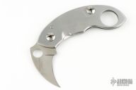 "Our Thomas/Spyderco folding Karambit is all-stainless with an arcing blade shape that carries through into a curved handle creating, in a sense, a large claw. Positioned at the end, for an index or pinky finger, the ring lets you to swing/rotate the blade into different grip positions. When closed an accessible nick/recess in the steel handle channels the thumb to, and then over, the Spyderco Round Hole for immediate blade deployment. To facilitate opening the blade even quicker, the hole is expanded to 13mm in diameter. On the backside, the handle scale is laser cut into a Chris Reeve Style integral Linerlock. The blade is made from VG-10 and double flat-ground with a finger guard behind the cutting edge and a sizable thumb-positioning spine cusp above the hole. These ergonomics merge making the piece feel comfortably curved and easily controlled in the hand. A flat, broad steel clip completes the package and is outfitted with the necessary hardware to position for tip-up/tip-down and left- or right-hand carry. Discontinued Product - No Longer Available." Includes original box. Excellent condition.