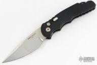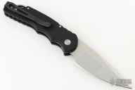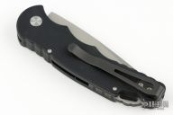 This Custom TR-5 by Pro-Tech Knives features a mirror polished compound hand ground blade by Mike Irie. The handle has a black aluminum handle with an abalone inlaid push button, stainless steel backspacer with lanyard hole, tip up black stainless steel clip. Comes with original box and papers. Excellent condition.  #162