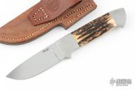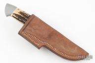 This Utility Fixed Blade from Patrick Burris features a mirror polished drop point blade with 0.147" blade stock and 1.226" blade depth. The handle is comprised of satin finished stainless steel bolsters front and rear, stag scales with steel pins over full tapered tang construction. Includes leather sheath with belt loop. Has a couple light scratches, excellent condition.