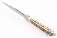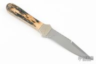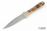 This knife by Bill King features a hand rub satin finished blade with full tang construction, .105" Blade Stock. .842" Blade Depth. The handle features jeweled finish nickel silver guard/bolsters, file worked blade spine and mammoth scales. Has some light scratches, and some patina, excellent condition otherwise.