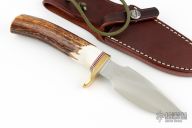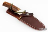 The Model 11 is the original drop-point blade. Designed by Tommy Thompson, noted Alaskan guide, in 1952 for big-game skinning, with point dropped below top of blade to prevent cutting too deeply through skins when used point first. This knife has a satin finished blade with notched thumbrest, .165" blade stock and 1.268" blade depth, hidden tang construction. The handle has a brass guard with stag grip and red/white/blue spacers. Comes with a brown leather sheath. Excellent condition.