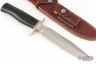 This Model 1-7 from Randall Made Knives features a satin finished clip point blade with sharpened top edge, .205" blade stock and 1.247" blade depth, hidden tang construction. The handle is comprised of a nickel silver guard, red/white/blue spacers, black linen micarta handle. Comes with brown leather sheath. Excellent condition.
