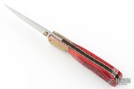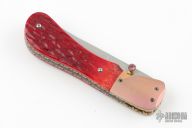 This linerlock by Bill King features a hand rub satin finished blade with single thumbstud. The handle has anodized and dovetailed titanium bolsters, jigged bone scales, fileworked and anodized titanium liner and micarta backspacer. Comes with a soft pouch. Has a couple light scuffs, excellent condition otherwise. #0166