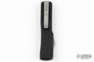 This California Legal UTX-70 features a 1.925" satin finished double edge blade with fuller. The handle is comprised of black anodized aluminum handle with bead blasted stainless steel hardware, thumb slide and tip down pocket clip. Dated 04/2014 with a S/N of 22862. Includes original box and paperwork. Excellent condition.