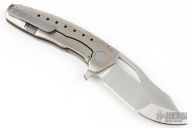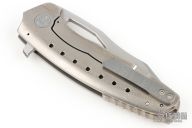 This Degman by DaracSteel features a two-tone clip point blade with dual thumb hole and a checkered flipper. The handle has an orange peel finished titanium frame with notched titanium backspacer and a tip up pocket clip. Damascus pivot and clip. Nice detent, lockup and blade seating. Excellent condition.