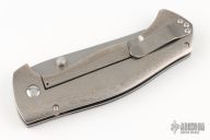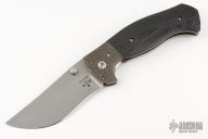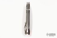 This Hydra from Les George features a tumble finished recurve blade with dual thumbstuds. The handle has a Damascus dovetailed bolster, titanium liner and frame with a carbon fiber scale, a tumbled titanium tip up clip. Nice detent, lockup and blade seating. Comes with a zippered case. Excellent condition.