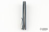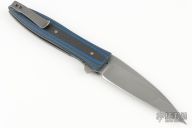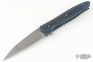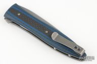 This Wharncliffe flipper by Brad Zinker features a stonewash finished multiground blade with flipper, .124" blade stock. The handle has black/blue carbon fiber scales, tumbled titanium liners and tip up titanium clip. Nice detent, blade seating and lock up. Excellent condition.