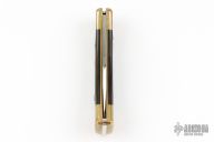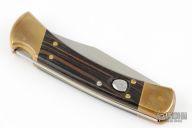 This Buck 110 Auto features a satin finished clip point. The handle has a brass frame with wood scales. Comes with original box, papers and black leather sheath. Excellent condition.