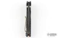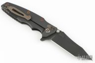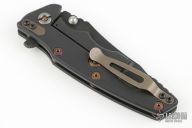 This Eklipse from Rick Hinderer features a black finished blade with notched thumbrest and flipper. Back G-10 scale and black stonewashed titanium frame and pocket clip. Dual thumb studs and notched thumbrest. Bronze hardware, and clip. Reversible pocket clip. Strong lock up, nice detent and blade seating is center. Has some light scuffs and scratches, great condition otherwise.