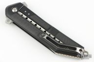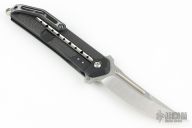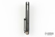 This 3/4 Kwaiken by Steelcraft features a satin finished blade with fullers and flipper. The handle has a DLC titanium frame with carbon fiber inlays, matching tip up clip with ceramic ball, polished and notched titanium backspacer. Rides on IKBS, nice detent, lockup and blade seating. Excellent condition.