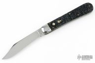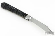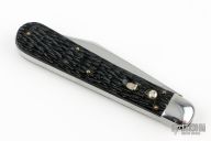 This antique auto by Schrade features a mirror polished clip point blade. The handle has steel bolsters, jigged scales, steel liners and backspacer, has safety. Nice action and blade seating. Has some light scratches and a little blade play, otherwise excellent condition.