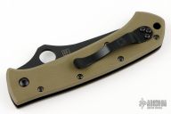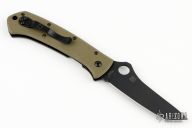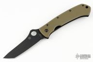 This Bob Lum designed folding knife by Spyderco features a black tanto style blade marked with the Lum Logo. Stainless steel liners. Textured green G-10 scales, tip up stainless steel clip. Comes with original box and papers. Nice detent, lockup and blade seating. New condition.