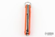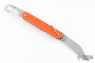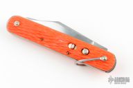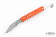 This knife by Schrade features a clip point blade. The handle has orange jigged scales, stainless steel liners and backspacer. Has Safety. Has some light scratches, otherwise the knife is in excellent condition.