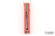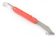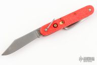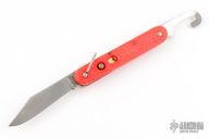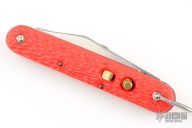 This knife by Camillus features a clip point blade. The handle has orange jigged scales, stainless steel liners and backspacer. Has some light scratches and blade play, otherwise excellent condition.