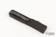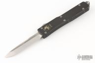 This UTX-70 OTF automatic by Microtech features a satin finished blade with a standard edge. The handle has a black aluminum frame with blasted stainless steel tip down clip. Serial number 0407 and dated 04/2004. Comes with original sheath. Has some light scratches, has a ding on the corner of the frame, otherwise good condition.