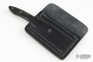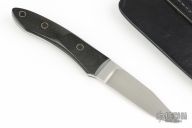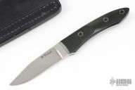 This Loveless Style Lamb's Foot by Ricardo Velarde features a hand rubbed satin finish blade, 1/8" blade stock, 3/4" blade depth. Full tapered tang construction with contoured black canvas micarta handle and three hollow stainless handle tubes. Excellent condition. Comes with a black leather pocket sheath.