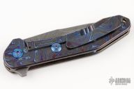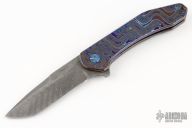 This Machairi by Chad Nichols features a Boomerang Stainless Damascus blade with false top edge and a flipper. The handle has a ZircuTi frame with anodized titanium hardware, tip up ZircuTi clip with hidden screws. Rides on bearings, nice detent, lockup and blade seating. Comes with a zippered case. Has a couple very light scratches, otherwise excellent condition.